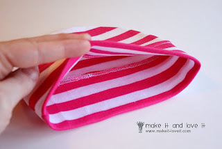 Сложить две половинки шапочки вместе и прострочить с правой стороны, оступая 1\4 дюйма. Затем, складываем пополам прямоугольный кусок и прострачиваем его.